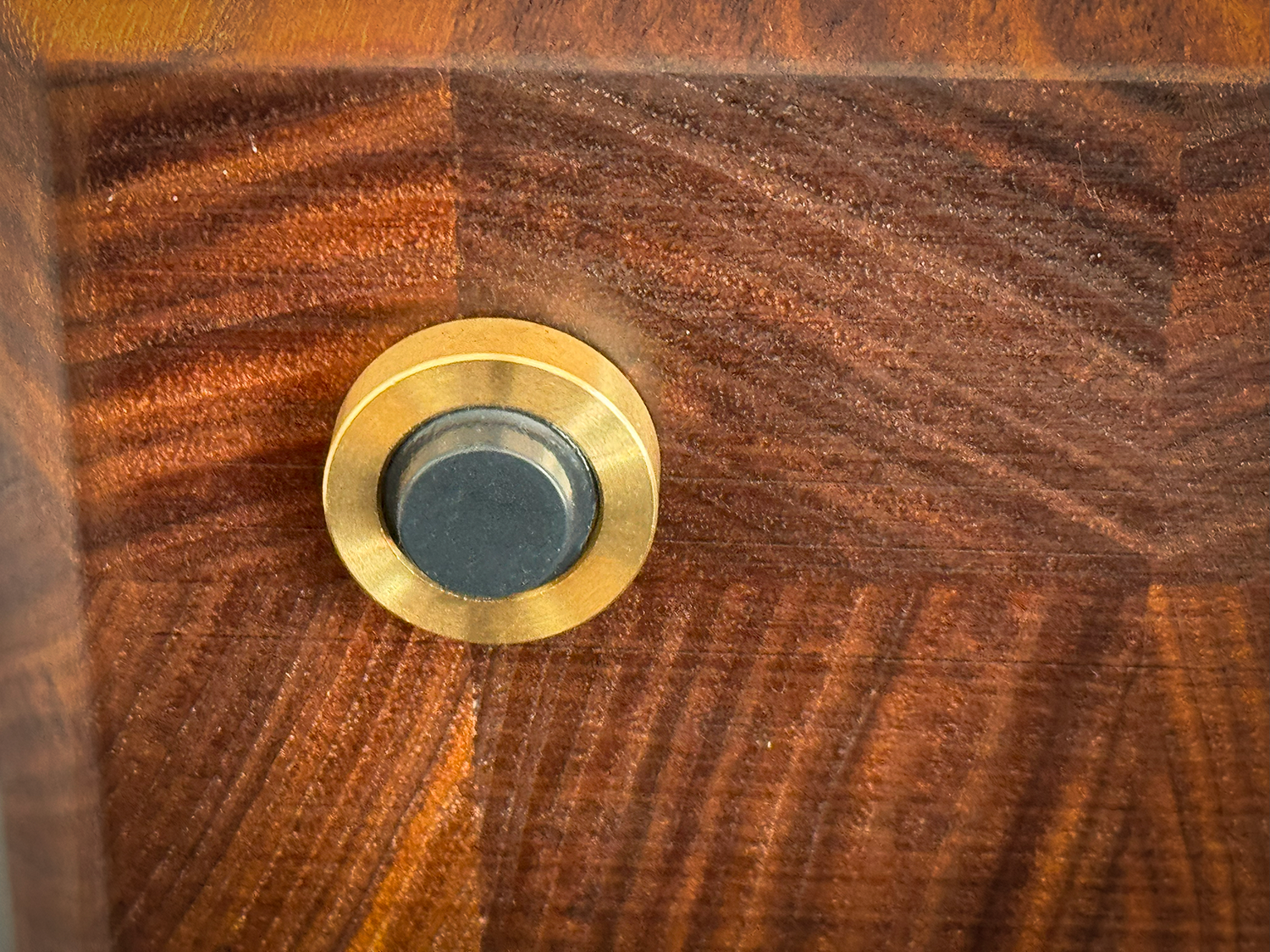 This board features a chamfered edge for easy handling and is elevated by elegant solid brass feet.